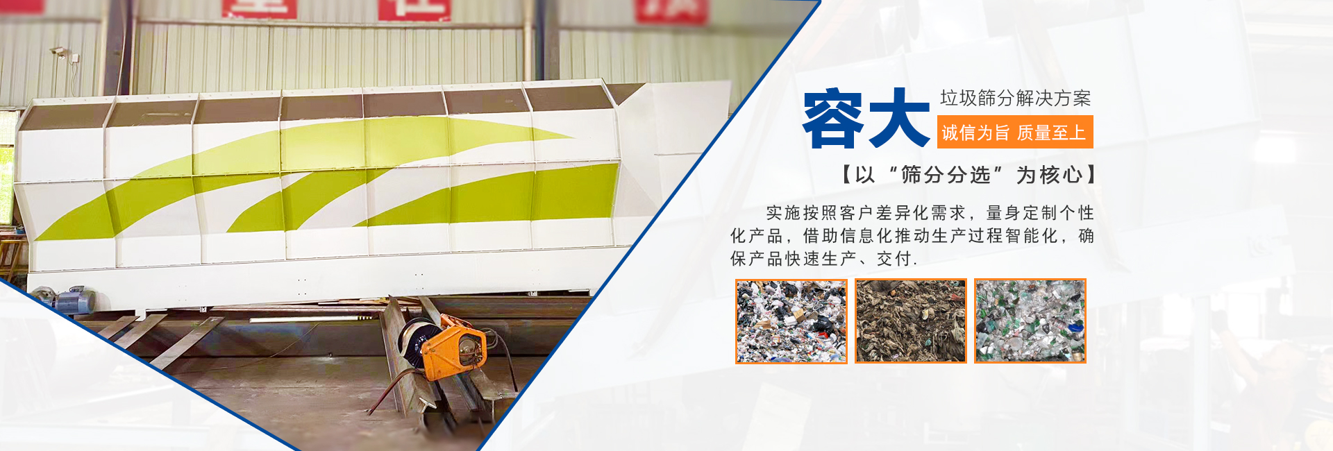 泉州容大機(jī)械有限公司是一家專(zhuān)研生活垃圾分選的企業(yè),以“篩分分選”為核心,實(shí)施按照客戶(hù)差異化需求,量身定制個(gè)性化產(chǎn)品,柔性化生產(chǎn)管理模式,以智能制造為主攻方向,以客戶(hù)需求為中心,借助信息化推動(dòng)生產(chǎn)過(guò)程智能化,確保產(chǎn)品快速生產(chǎn)、交付。生活垃圾處理領(lǐng)域內(nèi)的技術(shù)研究,利用篩分、分選技術(shù)的核心競(jìng)爭(zhēng)力,圍繞“智能、高效、節(jié)能、環(huán)保”八個(gè)大字為中心,為循環(huán)經(jīng)濟(jì)項(xiàng)下的各種生活垃圾處理項(xiàng)目提供成套的技術(shù)解決方案 ...